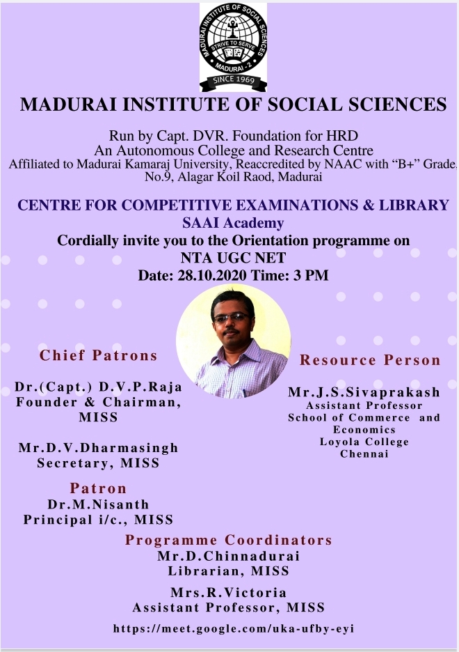 SAAI Academy is associated with Madurai Institute of Social Sciences to conduct Orientation programme on NTA – UGC NET December 2020 through online mode – Google Meet on 28th October 2020 by 3.00 pm.