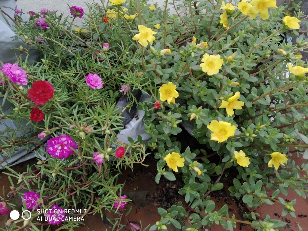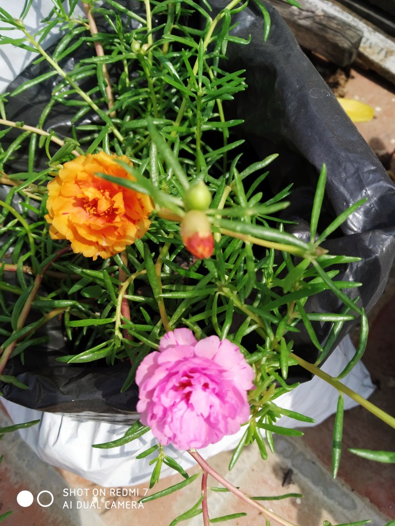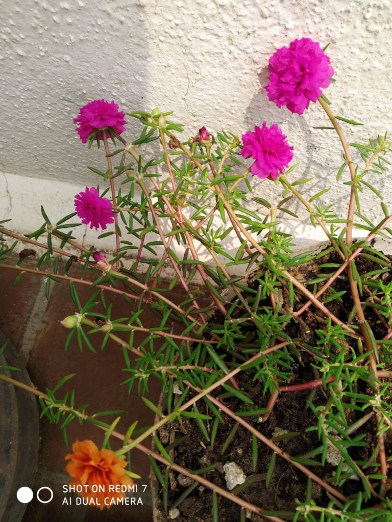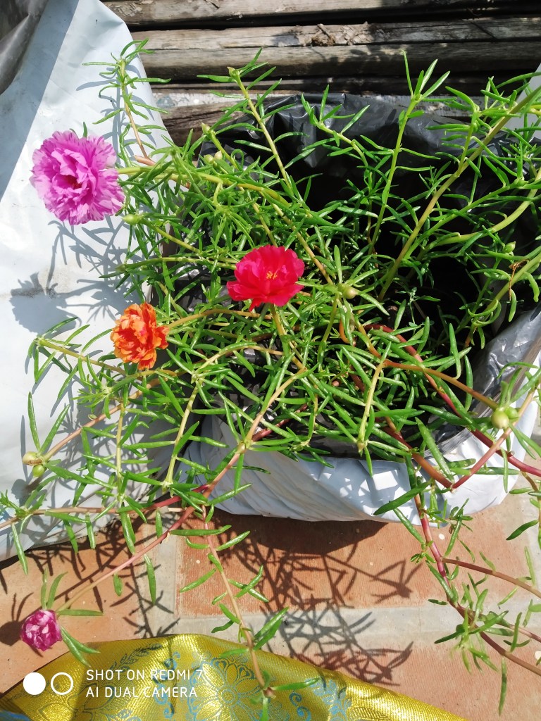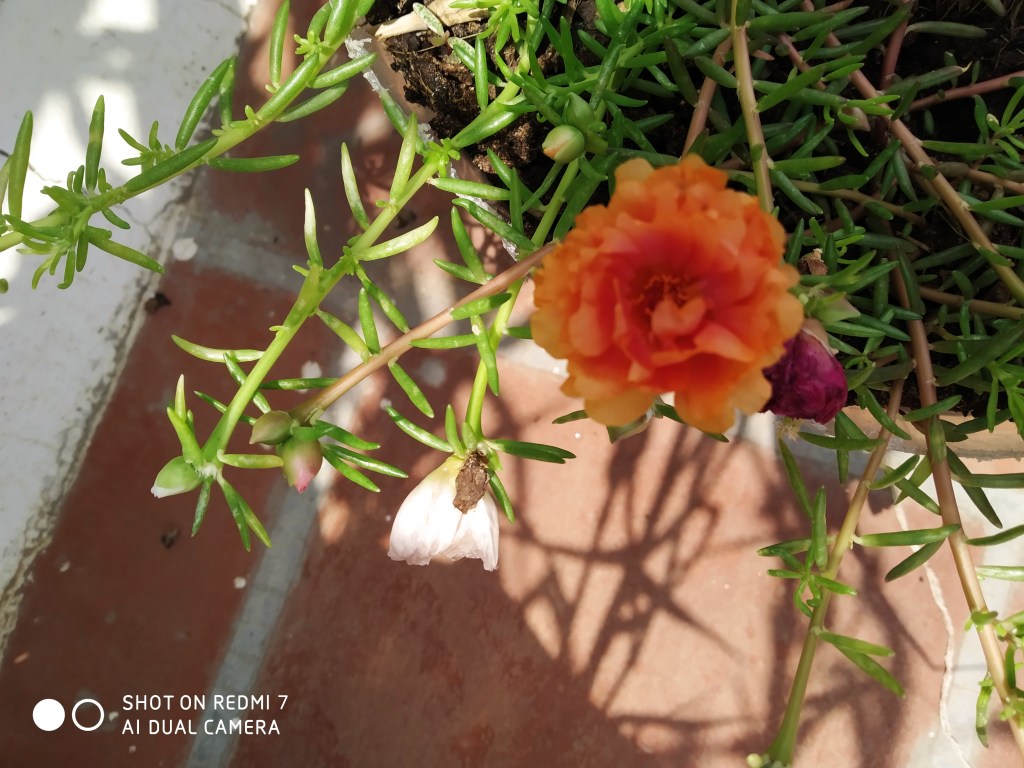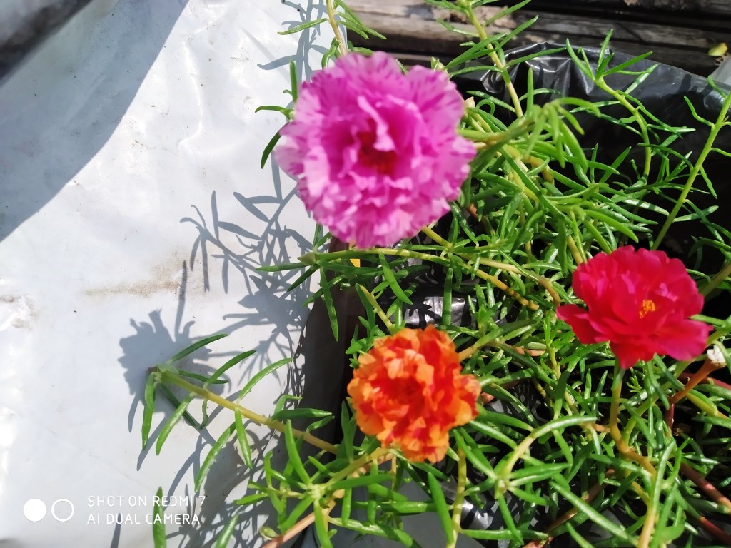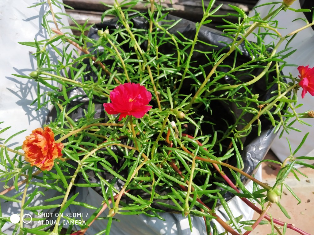 Moss rose / Table rose is a drought tolerant annual plant. Cold sensitive. It is cultivated throughout the world for it’s colorful flowers and foliage. The blooms are orange, pink, purple, yellow, red, white, and multiple colors. Plants grow as succulent foliage. Portulaca has narrow leaves and Purslane has broad leaves.
