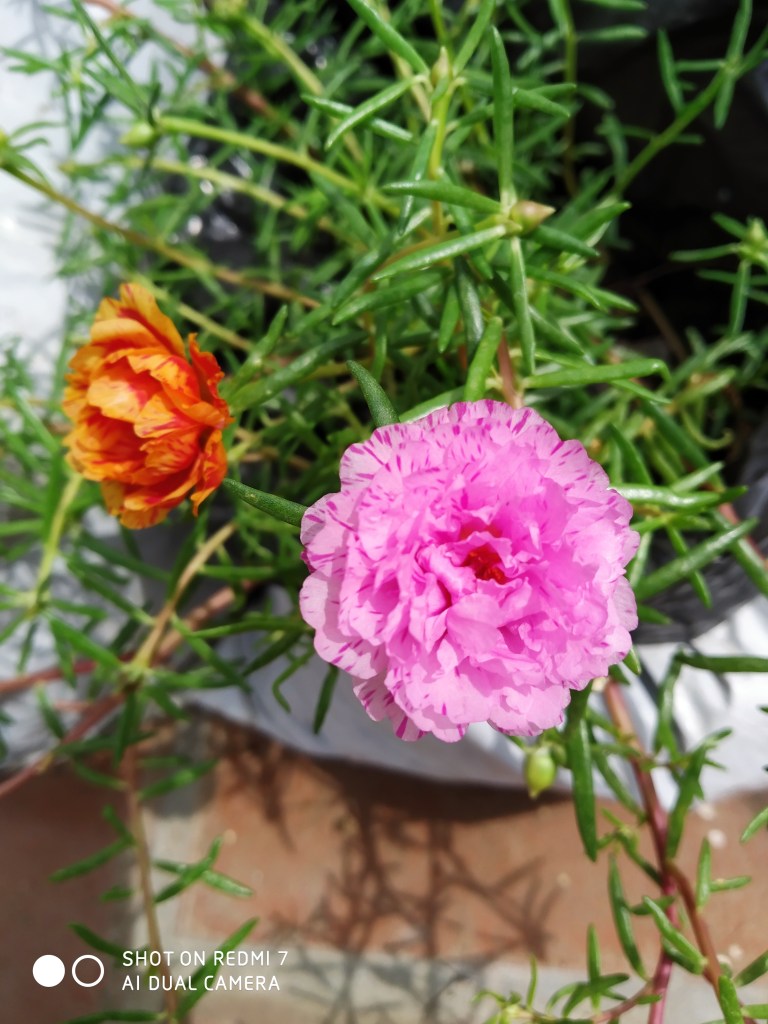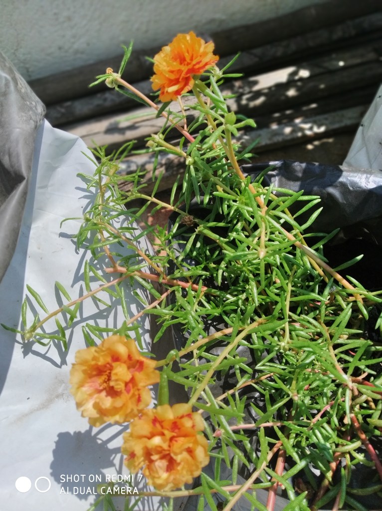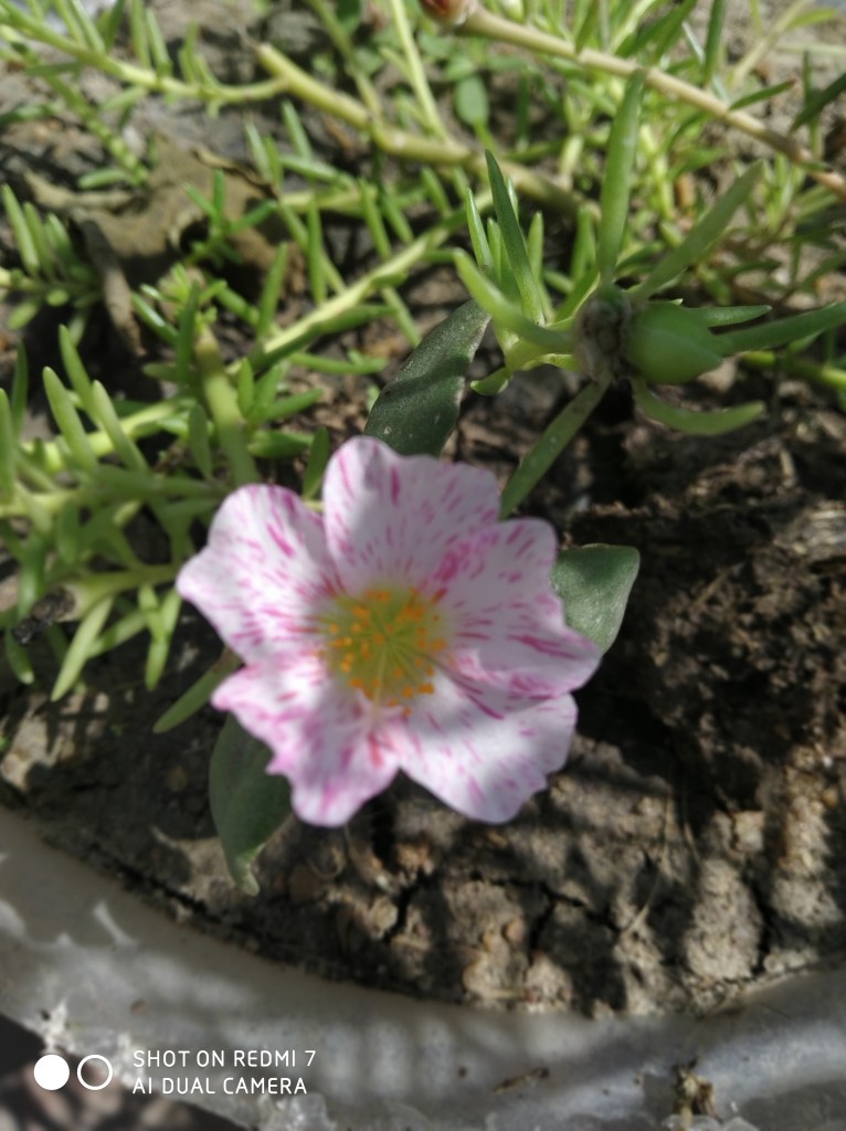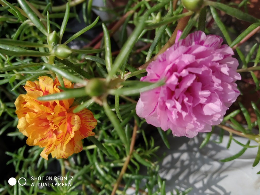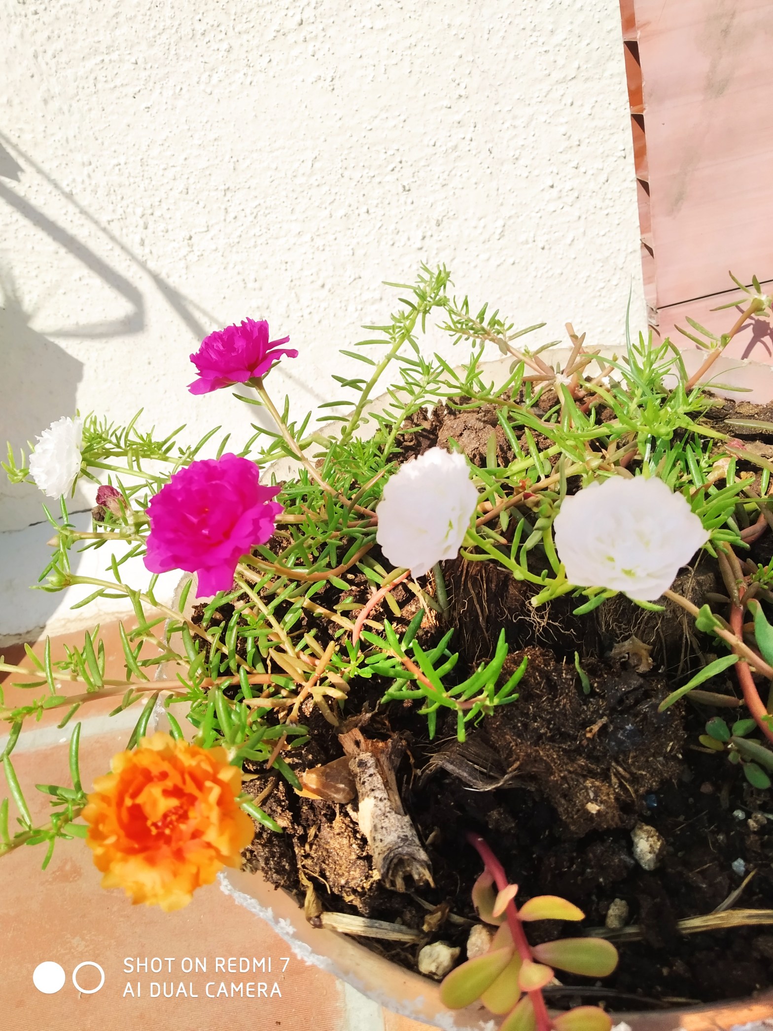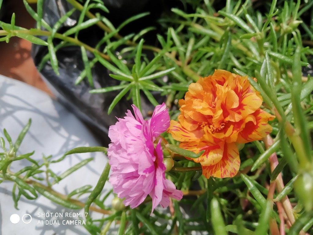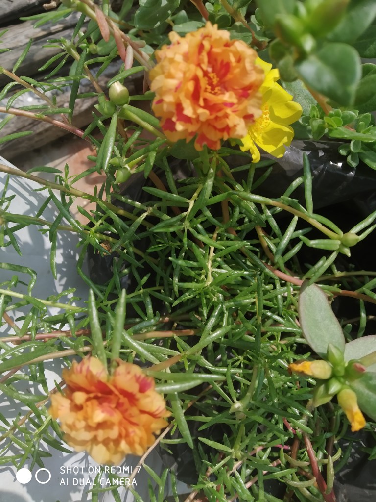 Moss rose / Table rose is a drought tolerant annual plant. Cold sensitive. It is cultivated throughout the world for it’s colorful flowers and foliage. The blooms are orange, pink, purple, yellow, red, white, and multiple colors. Plants grow as succulent foliage. Portulaca has narrow leaves and Purslane has broad leaves.
