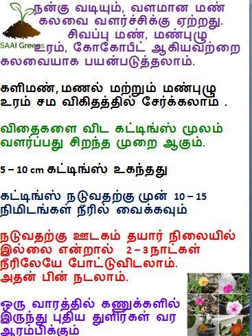 Propagating moss rose through cuttings is the best way of growing instead through seeds. Cuttings would be separated from the mother plants by giving slanting cut. 5 – 10 cm size cuttings will be good for its propagation. Separated cuttings would be placed in water for 10-15 minutes before planted in pot mix. Better to plant the cuttings during morning hours or evening hours to improves the germination percentage.