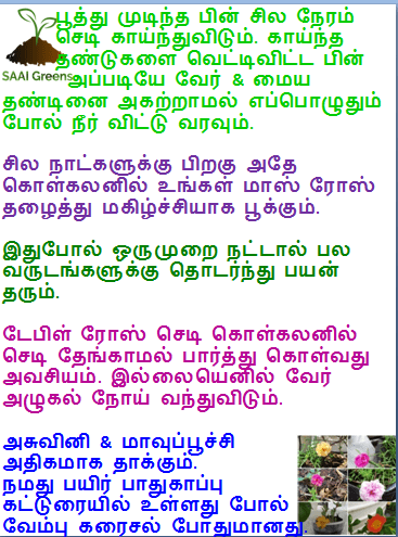 Table rose is a less maintenance plants as well beautify your garden through gorgeous flowers. Expect the flowers after a month from planting. Being a annuals, it will bloom for a particular period and stops blooming. Don’t worry. Cut down the bloomed tip portion of 2 cm from the top by the scissor after stop blooming.