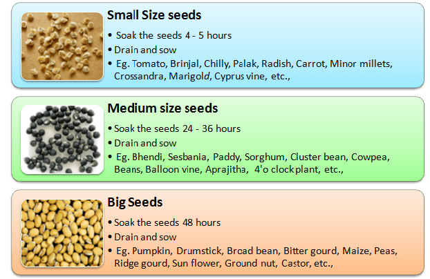- Make a hole on the planting area which is equal to the size of the seeds. Place the seeds horizontally (for big size seeds) and cover it smoothly. Avoid giving pressure on sown area. Sprinkle the water after sowing.