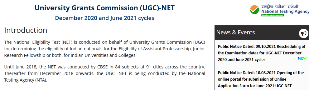 National Testing Agency (NTA) had rescheduled the examination dates for UGC-NET December 2020 and June 2021 cycles and the revised dates of examination were announced from 17 October to 25 October 2021.