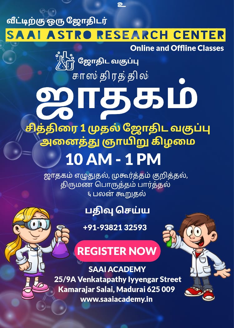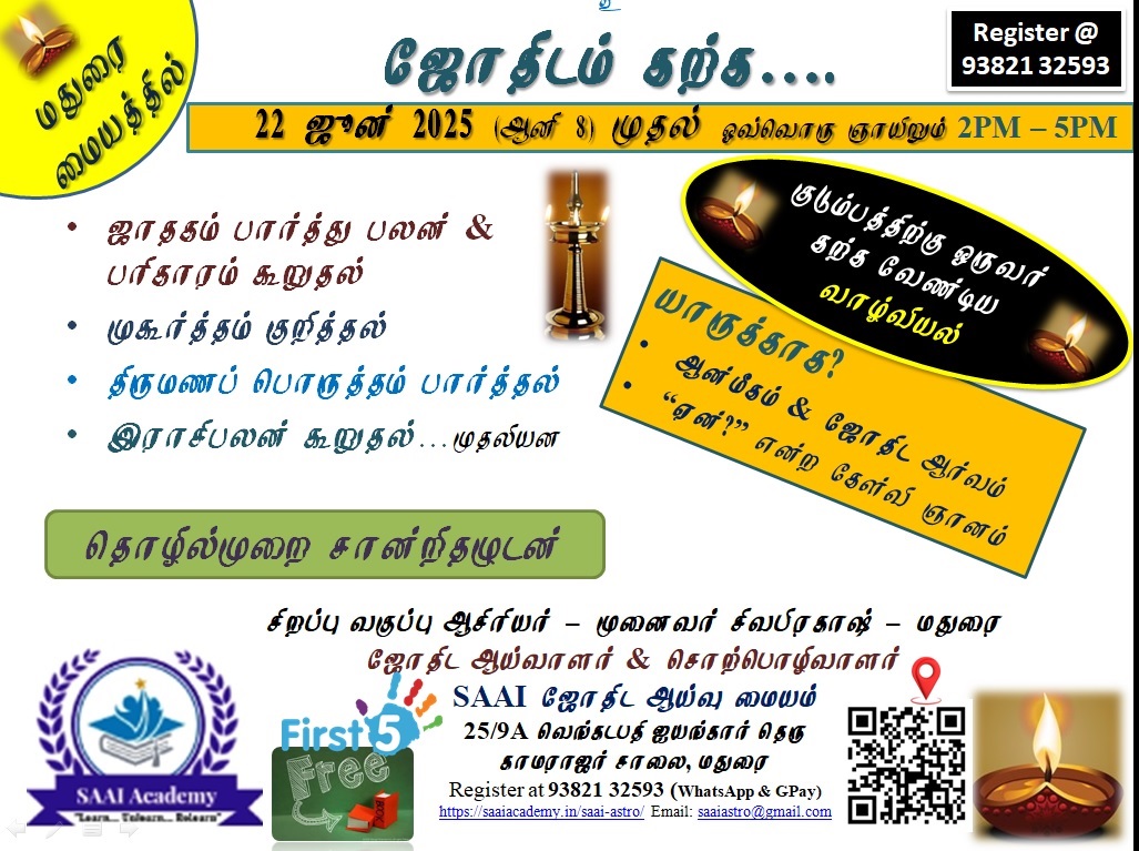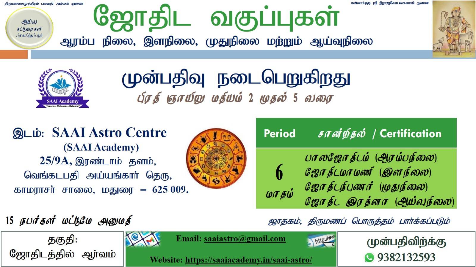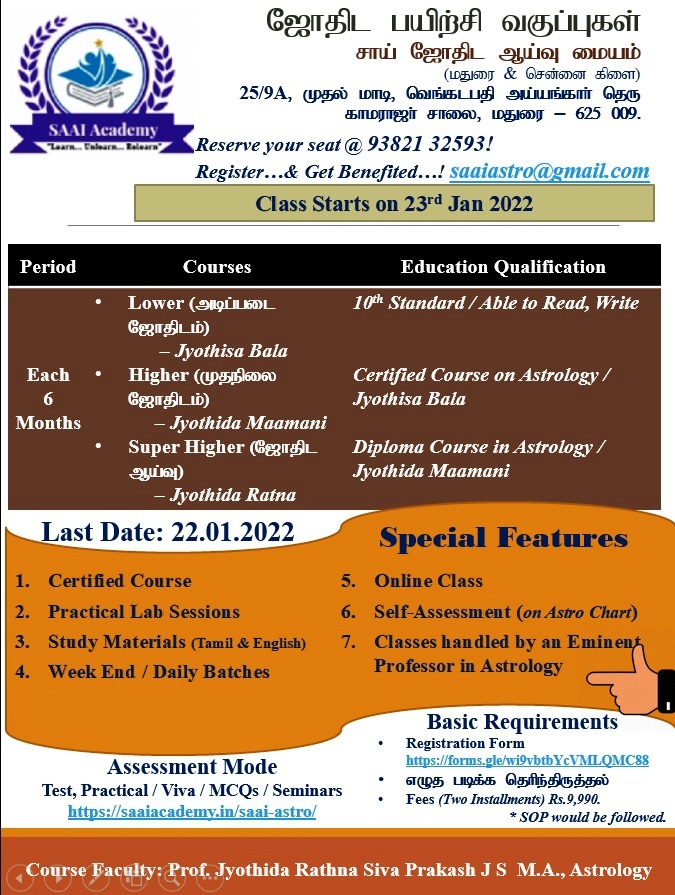 - Online Courses on Astrology – Basics and Advanced modules via English / Tamil.
